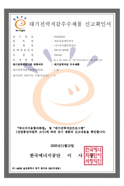 [대기전력저감우수신고확인서] IFH1230 (25.11.12)