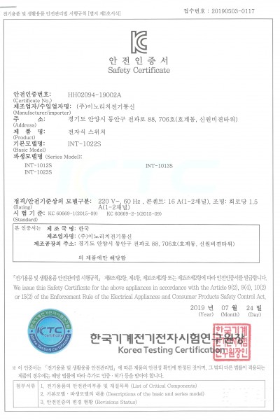 [전기안전인증서] INT-1022S 외 파생모델 (19.07.24)