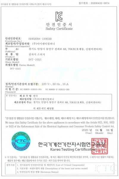 [전기안전인증서] INT-105S 외 파생모델 (20.04.06)