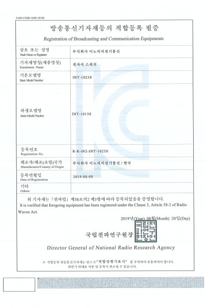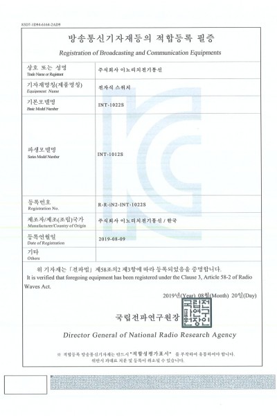 [방송통신기자재등록필증] INT-1042S 외 파생모델 (19.08.09)