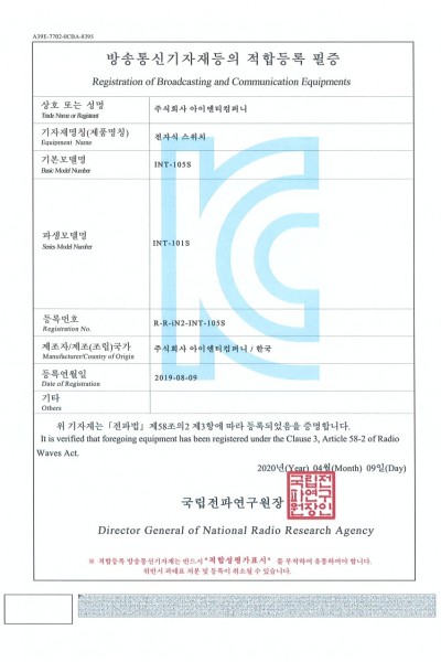 [방송통신기자재등록필증] INT-105S 외 파생모델 (19.08.09)
